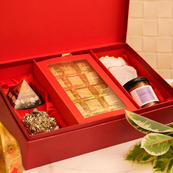 The Aura Prosperity Gift Set is designed to attract abundance, balance, and positive energy while adding elegance to gifting. A luxurious curation of powerful crystals, utility accents, and indulgent treats — perfect for loved ones or premium corporate clients.