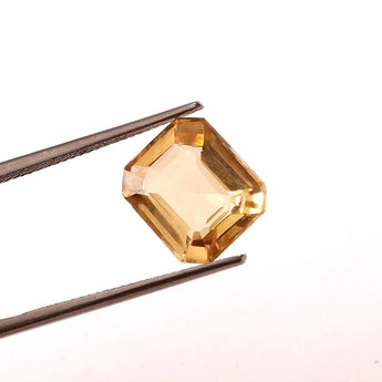 This 5.42-carat Citrine diamond-cut stone, weighing 5.9 Ratti, features a warm golden hue, with a precise diamond cut that enhances its brilliance. Known for its positive energy, this Citrine stone is perfect for both jewelry and energy work.